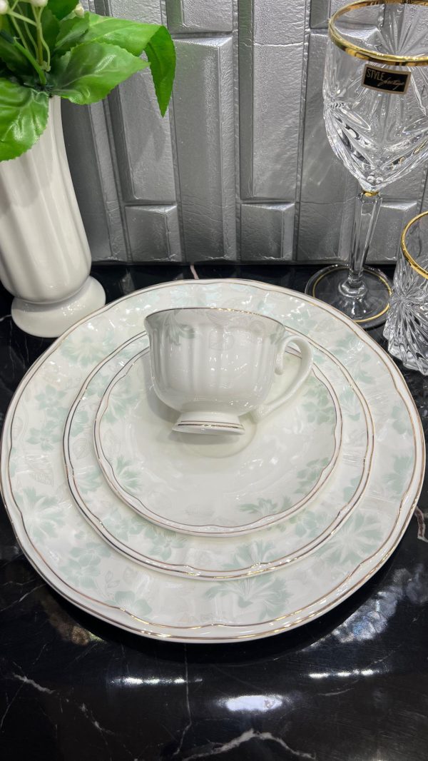 12 aş boşqab, 12 orta boşqab, 12 dərin boşqab, 12 desert boşqabı, 12 kasa-qaşıq, 12 fincan və nəlbəki,
